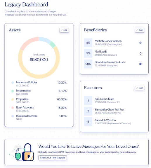 iWills.sg, for example, can help you with writing a will and listing your assets. The Legacy Dashboard feature is useful for consolidating your estate. You can use it to find out your net worth by listing your property, bank accounts, insurance policies, investments and business Interests. When you’ve written your will, it will reflect your estate distribution too. When you print out your will, what you’ve entered in the Legacy Dashboard will be generated as a Schedule of Assets – a very important document your executor will need in applying for Grant of Probate.